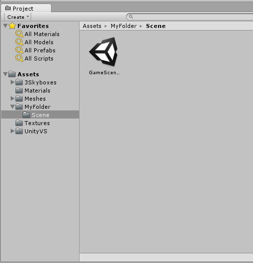 [File]→[Save Scene]があるのでそれをクリックします。いつもの保存する場所を決めるウィンドウが出てくるので、このプロジェクトフォルダの[Assets]→[MyFolder]を選択し、その中に[Scene]というフォルダを作りそこに好きな名前で保存しましょう。